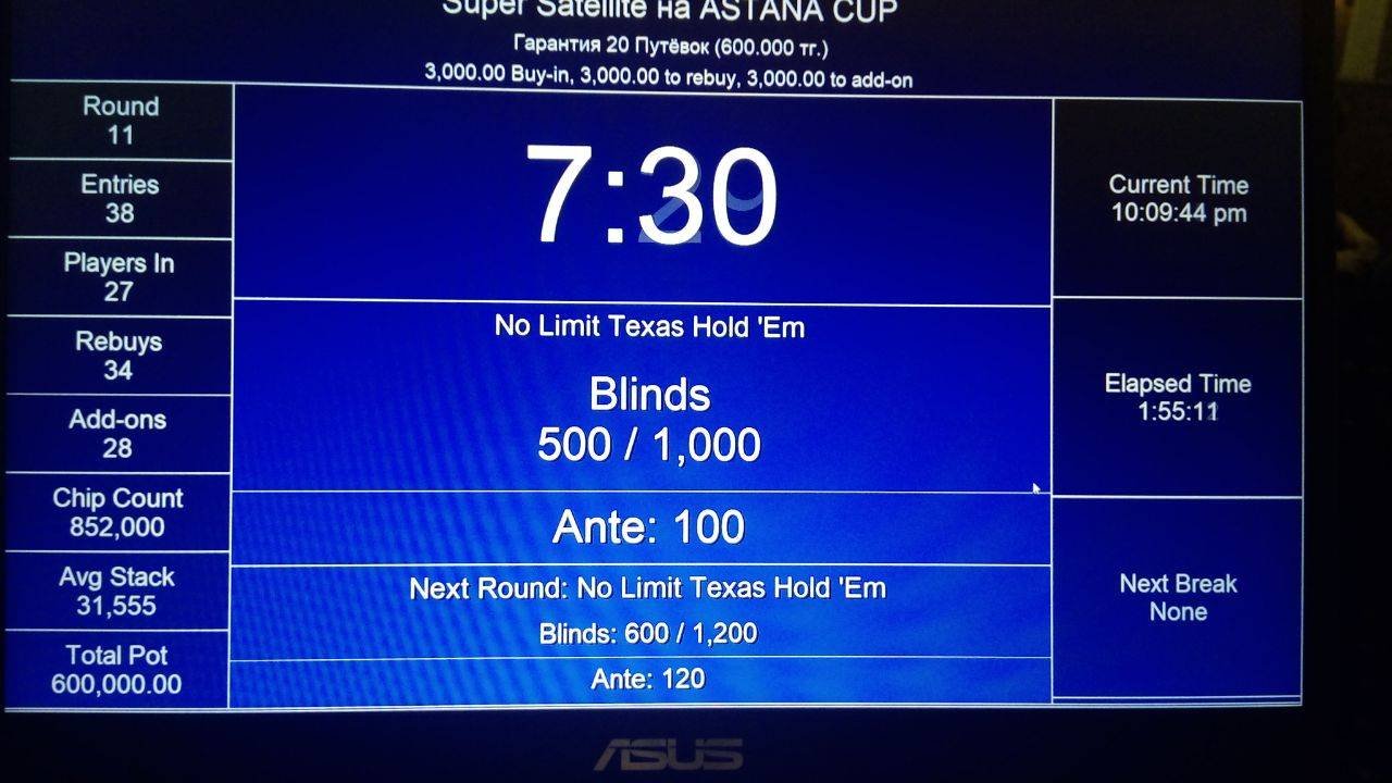 Хочется напомнить, что уже на предстоящей неделе (с 3-го по 5-ое Августа), мы будем играть в очередной, интереснейший Турнир в нашем клубе «GRAND BINGO»: «ASTANA CUP», с Минимальным Гарантированным Призовым Фондом в 3 Миллиона!!! А сегодня у нас прошёл Super Satellite, где мы разыграли 20 Путёвок на предстоящее событие. И как же это было?!!…