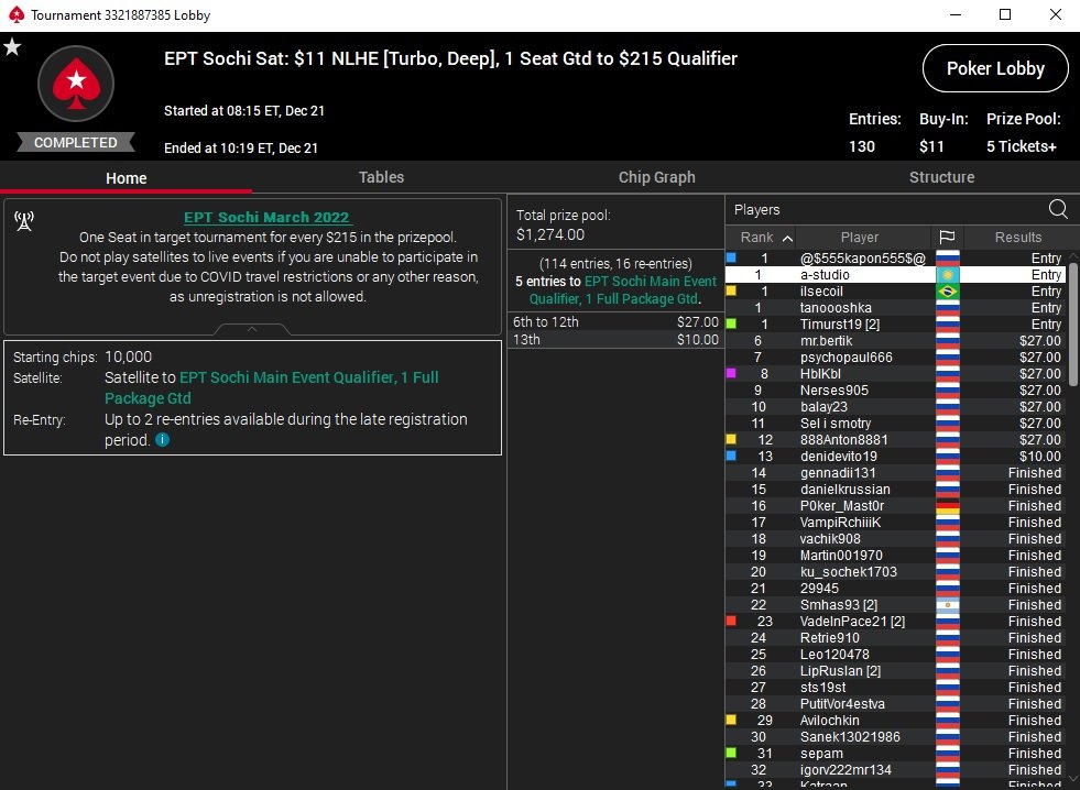 EPT в Сочи пройдет с 18 по 27 марта 2022г, а Главное событие стартует 22 числа.