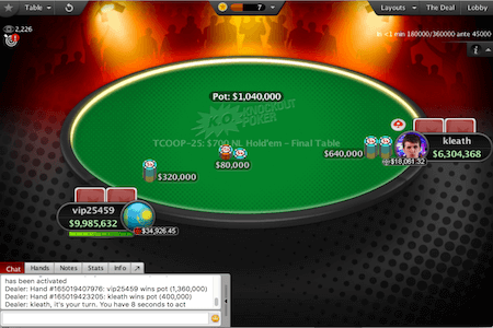 В хедз-апе против очень сильного профи Бьорна “kleath” Клитерссона ($7,8 млн. призовых в онлайн турнирах), преимущество Славы по фишкам составляло 1 к 2,7 (12,720,632 и 4,609,638).