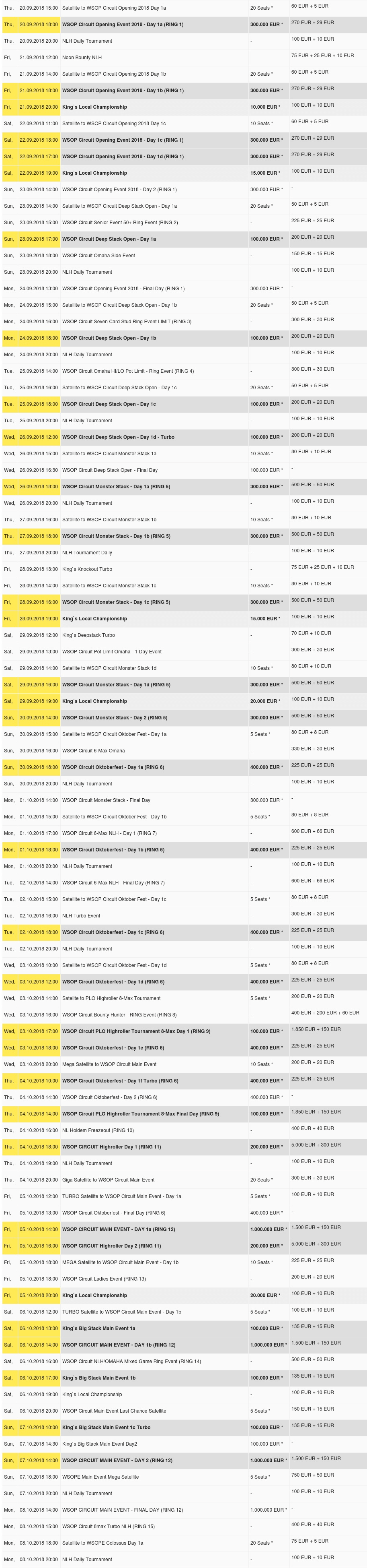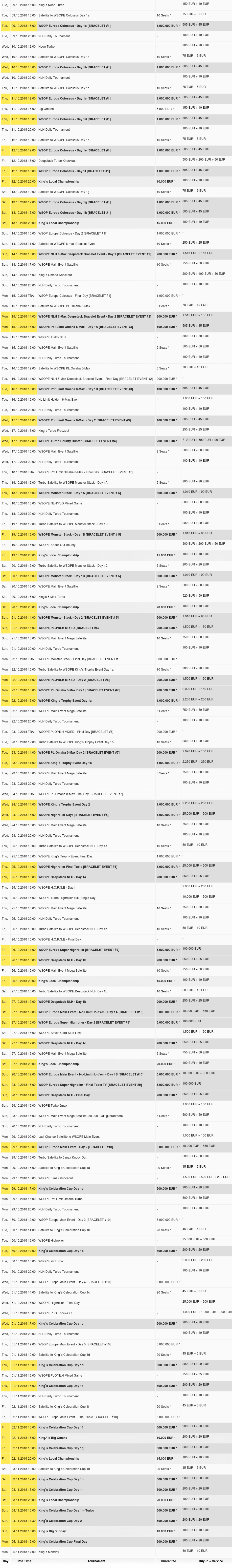 Первый официальный турнир с золотым браслетом начнется во вторник, 9 октября, в 18:00 — Colossus с бай-ином €550 и восьмью стартовыми флайтами. Гарантия события €1,000,000. Завершится серия 2 ноября финальным столом Главного события за €10,350 и гарантией €5,000,000.