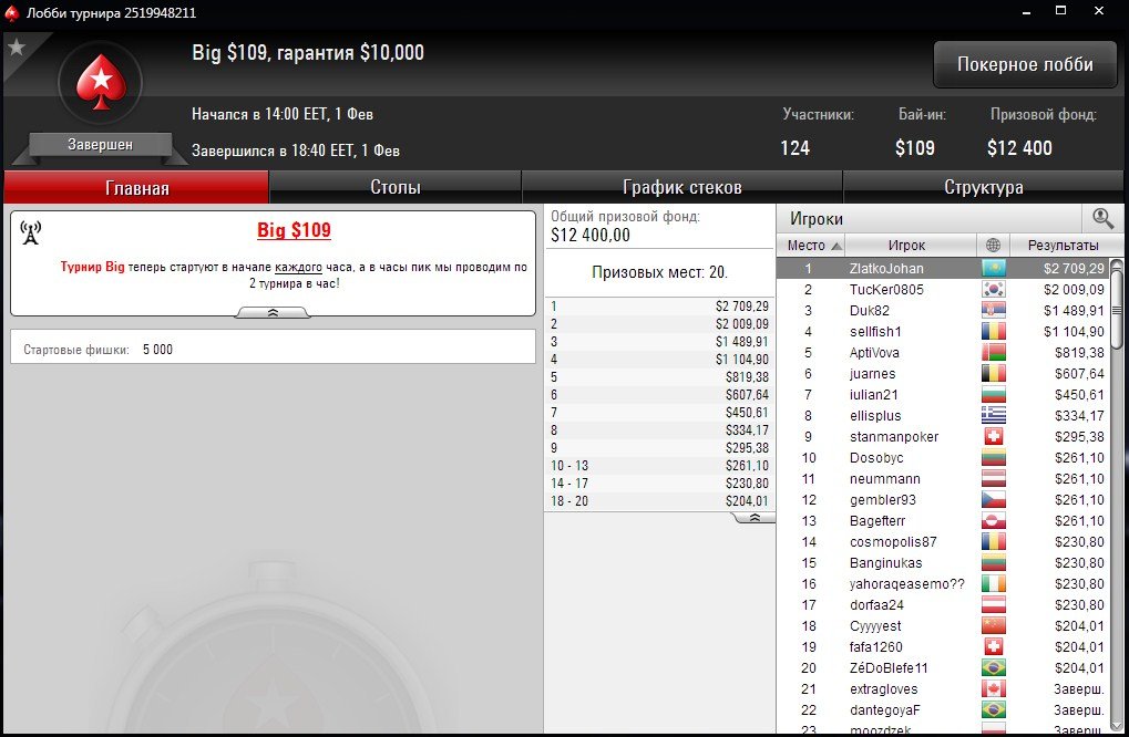 Василий (ник “ZlatkoJohan” на PokerStars) стал лучшим в Big $109 с гарантией $10K.